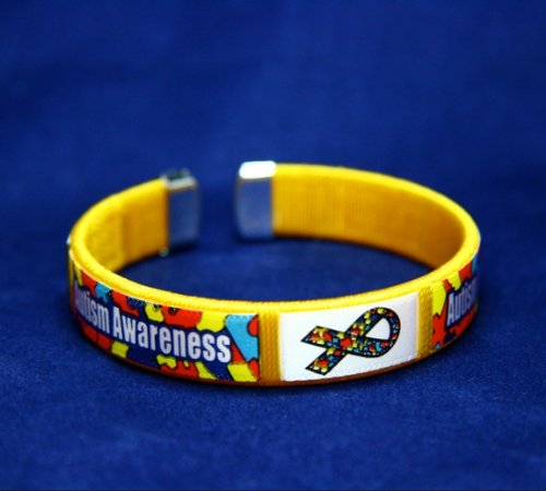 | This Autism awareness ribbon bracelet is great because it is a flexible bangle that is bright yellow with Autism puzzle ribbons with the words, Autism Awareness. ...Read more |