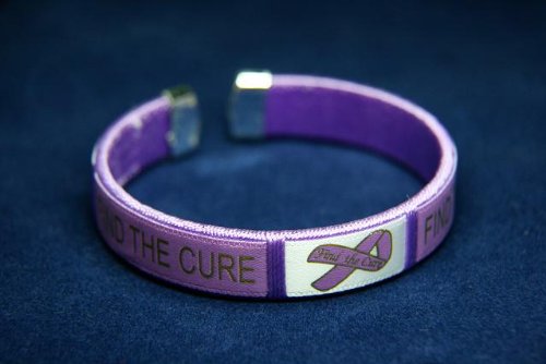 | This is a great purple ribbon bracelet. It is a flexible bangle that has purple ribbons with the words, Find The Cure. ...Read more |