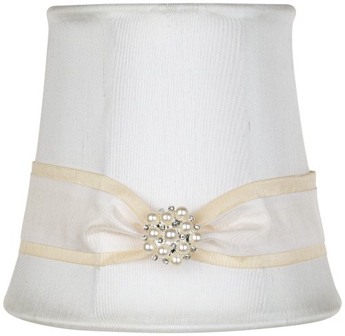 | Give a fresh new look to a chandelier or other small fixture with this delightful white fabric bell shade. The beautiful white faux silk fabric is draped with a white and cream ribbon featuring a pearl and rhinestone button accent. A quick and easy way to update your decor. ...Read more |